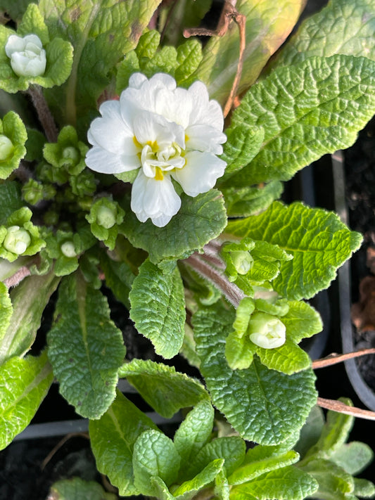 Primula Southwell white jack in the green 'Dawn Ansell'