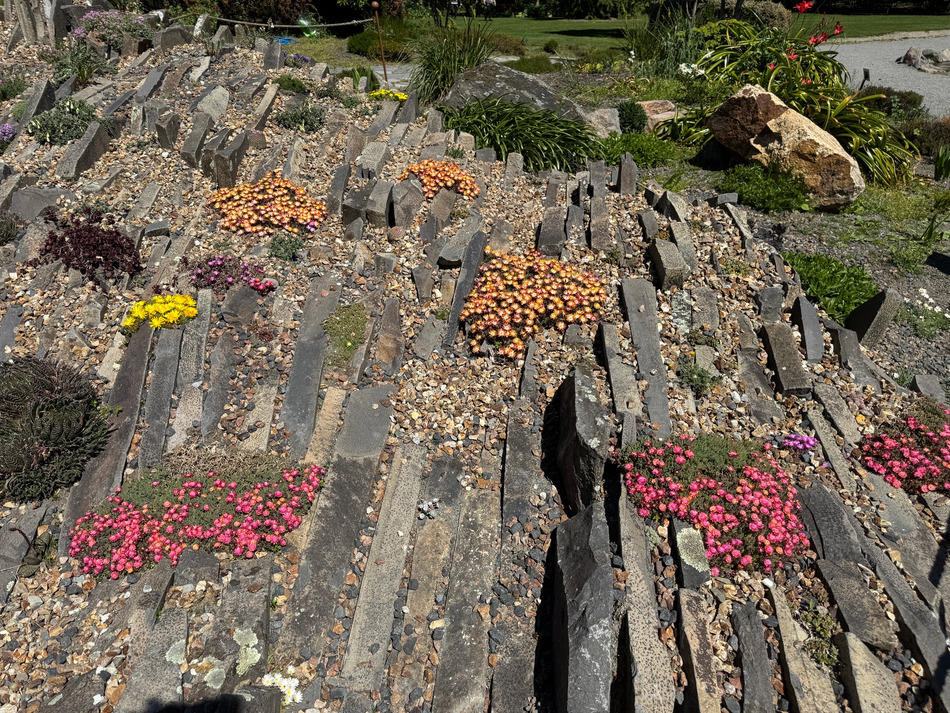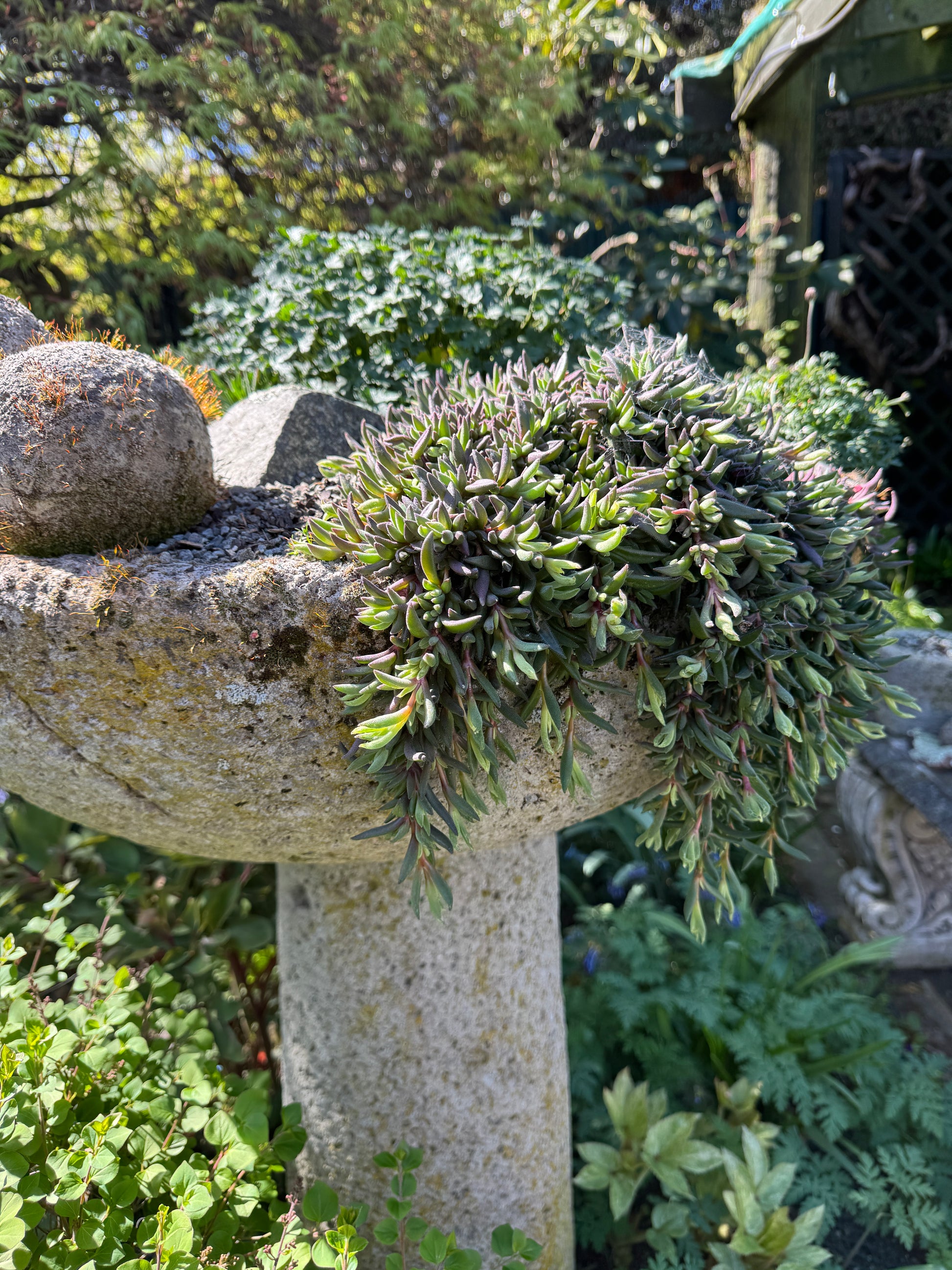 A delightful ice plant with gorgeous flowers in summer, pop round concrete steps and paths, rock garden