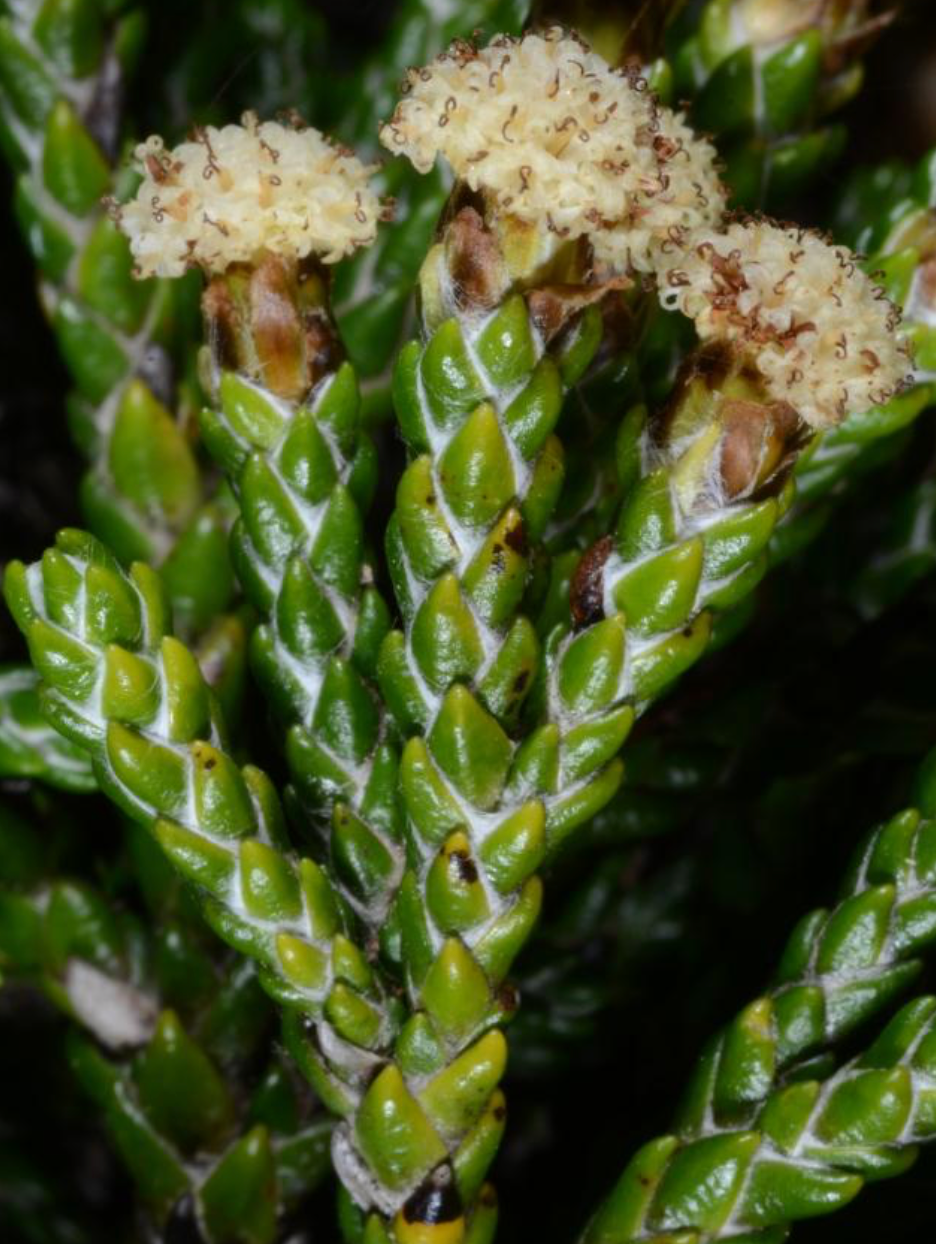 This unusual low shrub forms broad mounds of upright stems densely packed with tiny leaves. Flowers are wee creamy buttons. 30cm H x 50cm W. Easy in moist sunny open positions with cooler gritty soils. Old plants, 10cm tall.