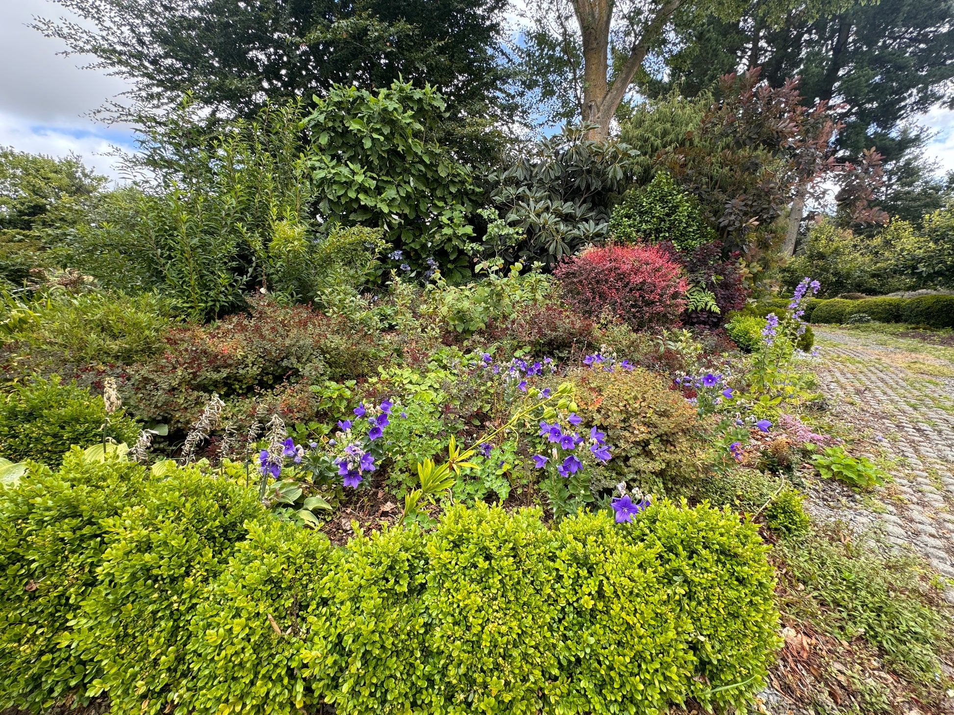 Balloon Flower. Lovely blue flowers of occasionally pink blooms in late summer. Popping up in spring, when it is a good idea to remove the old stems that were marking their spots. They have a fragile, fleshy root system so dislike disturbance and transplanting. Deadheading is good. Ordinary soil but with drainage. 60cm.